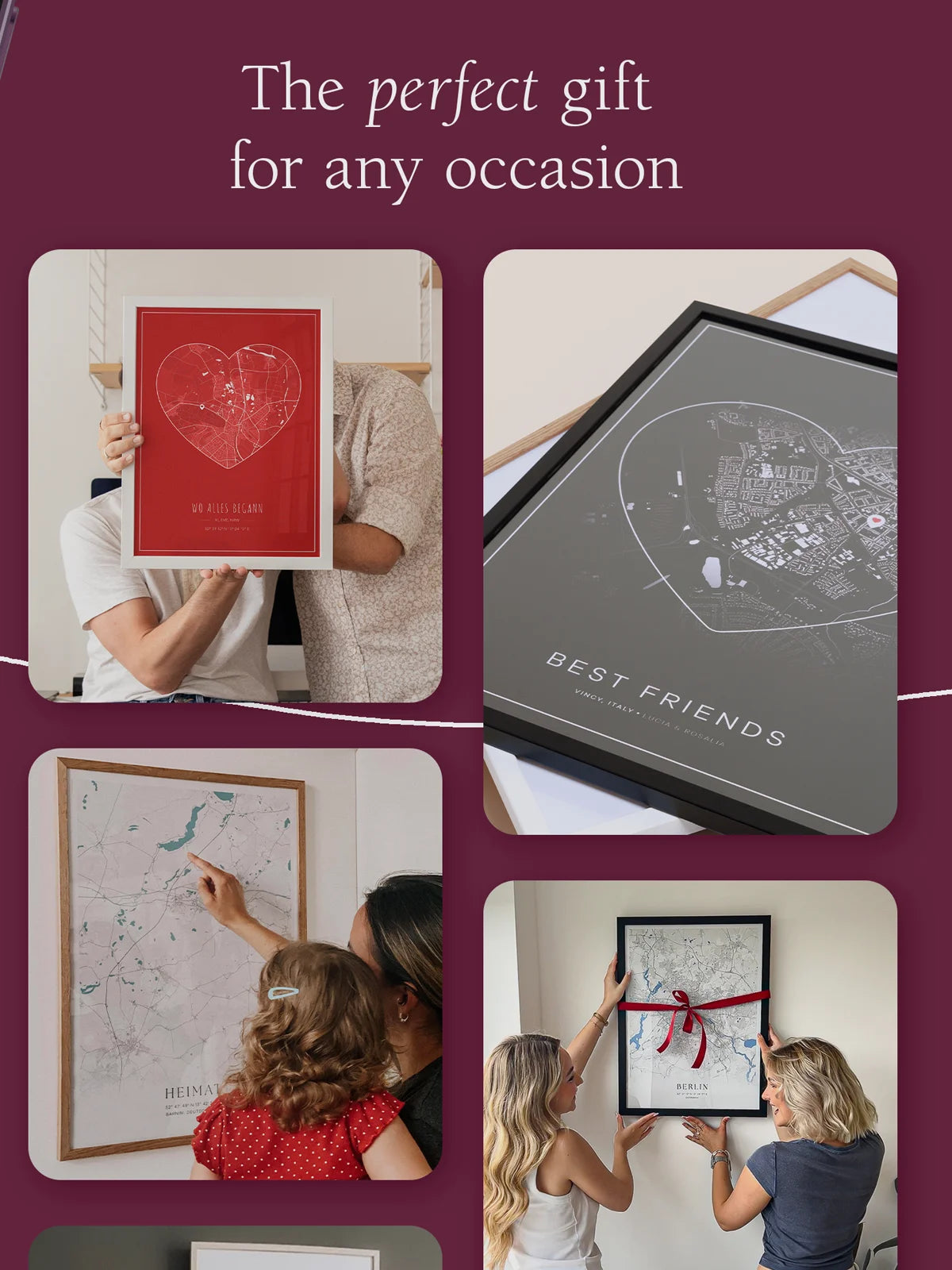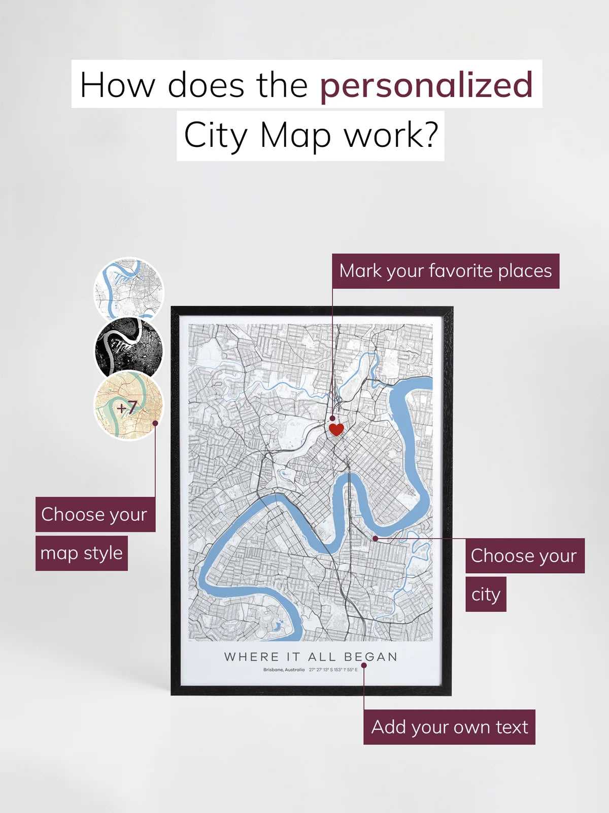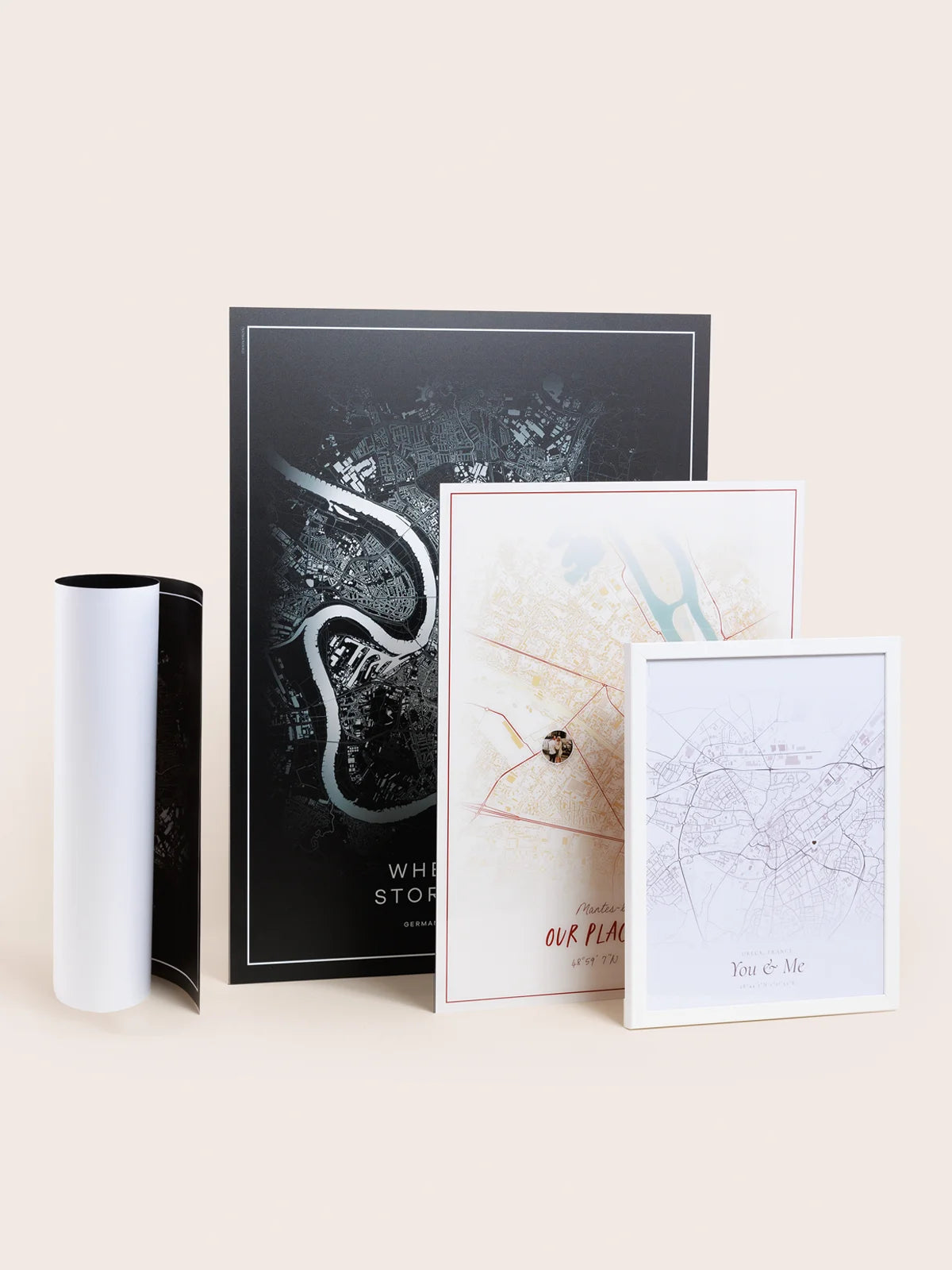 Our City Map is a personalized gift that tells your personal story of a city. Choose a location that's important to you and transform the map into your own story. Place markers or pictures precisely at the locations that matter to you and capture the special moments that make the city yours. Our design templates help you express your story as you want to tell it – whether as colorful wall art or a minimalist poster.