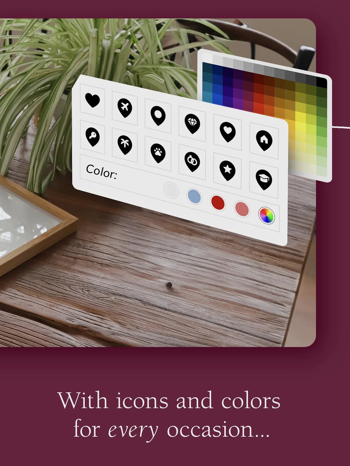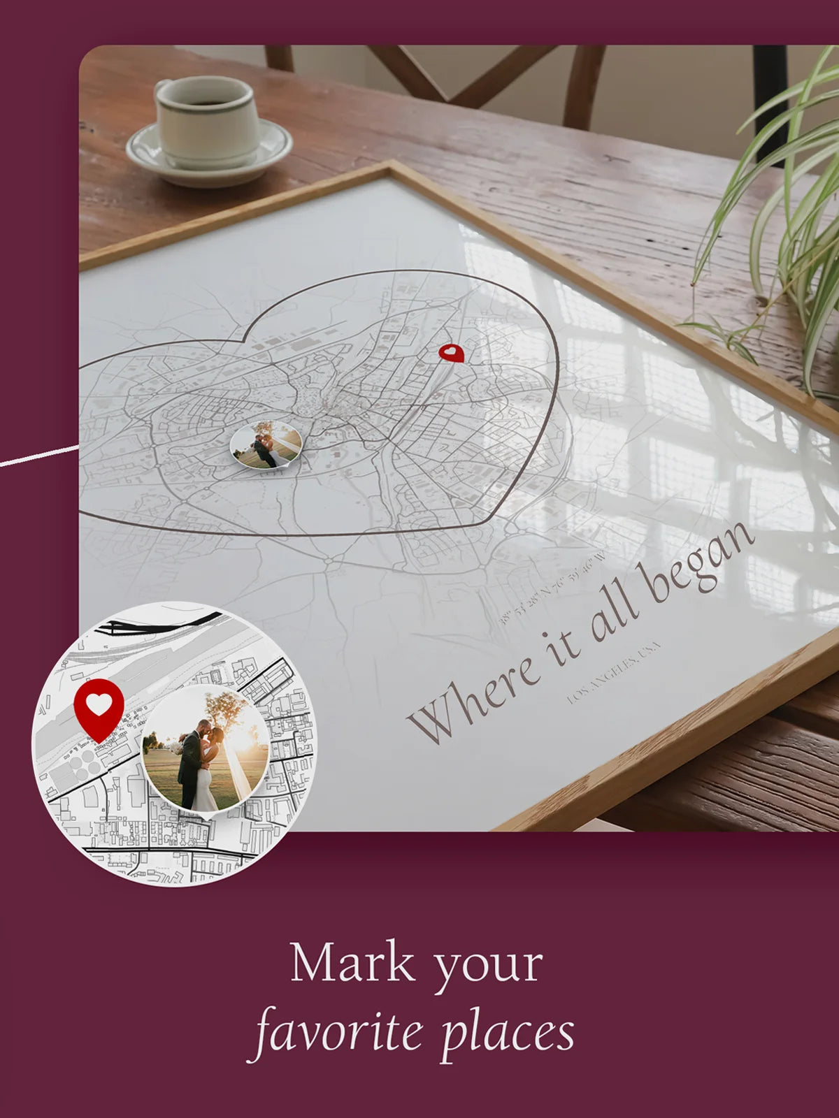 Create a unique gift that brings shared memories to life. For example, you could give your partner a map of your relationship journey: from your first date, to your first home together, all the way to your engagement – you can show where each and every milestone happened. A special housewarming gift, an anniversary present for him or her, or a thoughtful wedding gift.